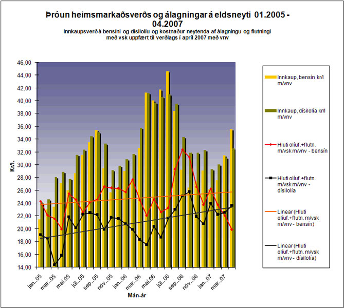 Eftirfarandi línurit sýnir þróun heimsmarkaðsverðs á bensíni og dísilolíu og kostnað neytenda af álagningu og flutningi á hvern lítra af eldsneyti frá janúar 2005 út apríl 2007.
