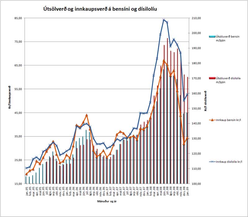 Kostnaður neytenda vegna álagningar og dreifingarkostnaðar olíufélaganna á dísilolíu hefur hækkað um 63% frá árinu 2005, hvorki meira né minna – úr kr. 20,60, í kr. 33,60 á lítrann. Þessar tölur eru uppreiknaðar miðað við vísitölu neysluverðs til dagsins í dag. Hér er því um raunhæfan samanburð að ræða,