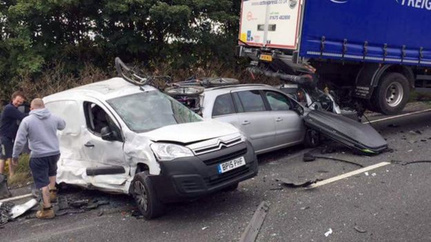 Vörubílstjórinn hélt því fram að áreksturinn hefði orðið vegna þess að hemlar vörubílsins hefðu orðið óvirkir. Það reyndist rangt. Mydböndin sýna bílstjórann upptekinn við að horfa á símann sinn. Á síðasta augnabliki lítur hann upp en þá er það um seinan. Það dapurlega er að innan við klukkutíma fyrir slysið hafði bílstjórinn undirritað skriflegt loforð við vinnuveitanda sinn um að nota ekki farsímann í akstri.