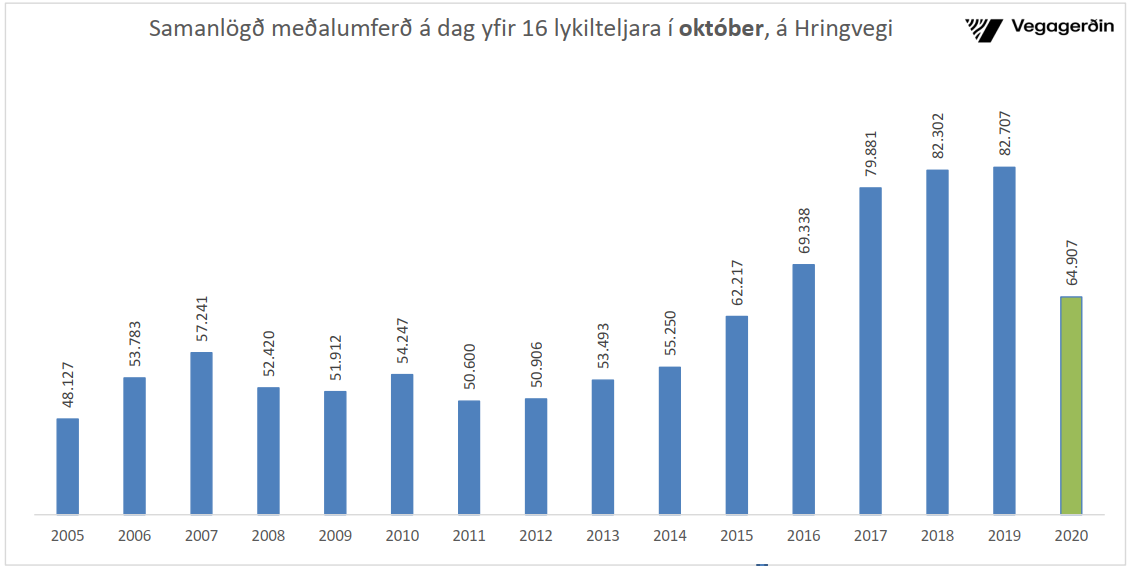 Umferð yfir 16 lykilteljara Vegagerðarinnar á Hringvegi dróst saman um 21,5% í nýliðnum október borið saman við sama mánuð á síðasta ári. Mest dróst umferðin saman um lykilteljara á Norðurlandi, eða um tæp 38% en minnst um teljara á og í grennd við höfuðborgarsvæðið eða um tæp 13%. Þetta er langstærsti samdráttur í umferð yfir þessi 16 snið sem hefur mælst.