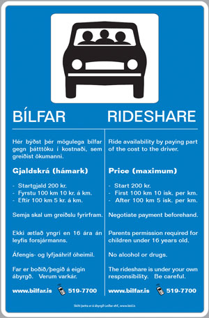Á því skilti sem Leið ehf hefur sett upp er miðað við að farþegar taki þátt í kostnaði ökumanns við aksturinn og greiði beint til hans fyrir farið. Upphafs- eða startgjald á mann er 200 kr. og síðan 10 kr. á kílómetra fyrstu 100 km en 5 kr. á km eftir það. Er miðað við að um hámarksgjald sé að ræða. Þá er miðað við að farþegar séu ekki yngri en 16 ára nema samþykki forsjármanns liggi fyrir en að ósk sveitarstjórnar í Súðavík er miðað við 18 ára aldur farþega og ökumanns þar. Gefið er upp símanúmer sem hringja má í ef afla þarf upplýsinga eða koma einhverju á framfæri og vísað er á vef, sem reyndar hefur enn ekki verið lokið við, www.bilfar.is, þar sem frekari upplýsingar og fróðleik verður að fá.